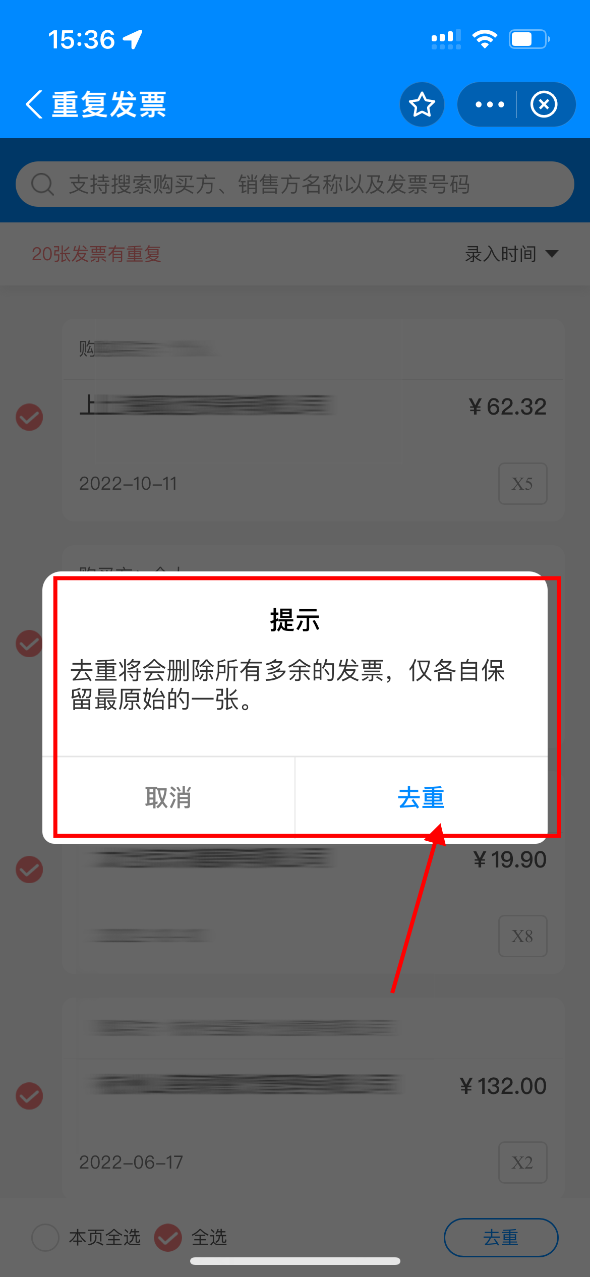 提示“去重将会删除所有多余发票,仅各自保留最原始的一张”,点击【去重】